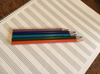 I recently studied a soprano role in its entirety, and decided to use different colors to highlight different parts of the range, with the highest notes going to violet end of the spectrum, and the lowest notes going to the red end of the spectrum. (I left out the yellow and red pencils from this photo, because I use those pencils for general highlights, and correcting.) What you see here is orange, green, blue, indigo and violet. And voila! The violet is the shortest, because I used it the most for the highest part of the range. The pencils get longer, the lower you go on my voice “spectrum,” which reflects the fact that the role has fewer notes in those ranges.